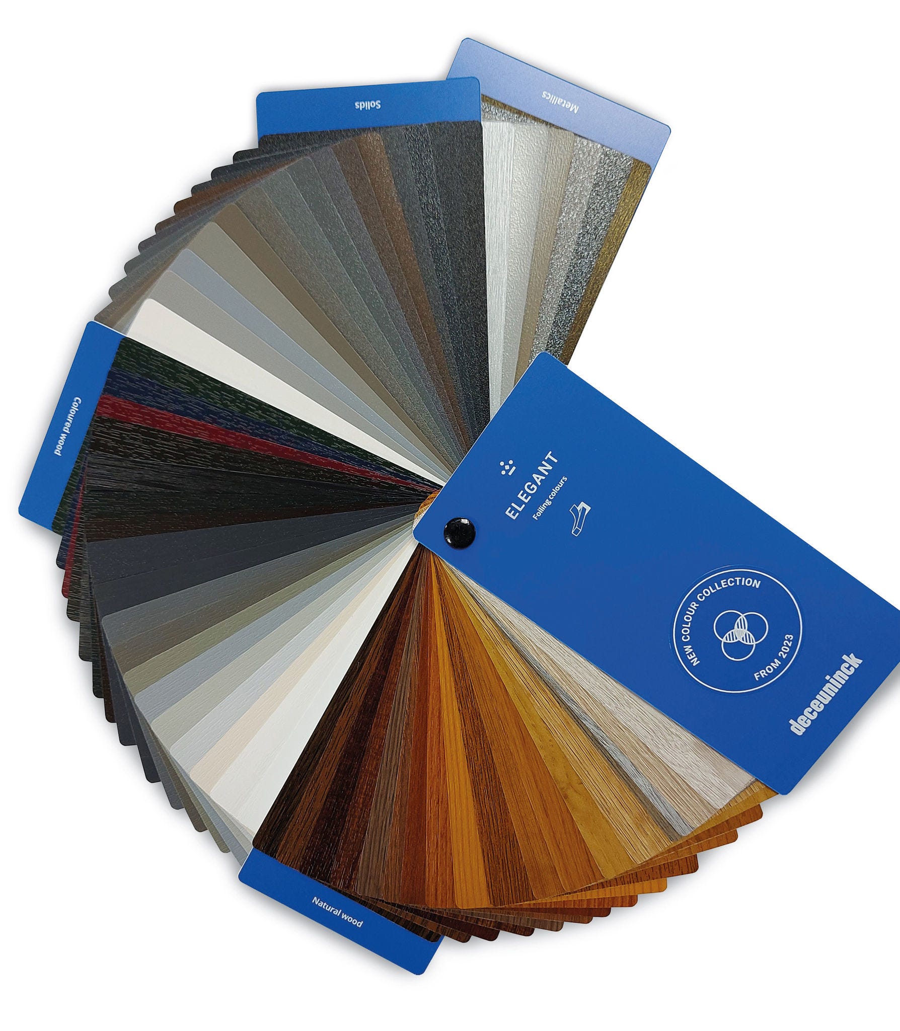 Kies uit meer dan 50 hoogwaardige foliekleuren, verdeeld over vier categorieën: natuurlijke houtstructuren, gekleurde houtstructuren, solids en metallics. Alle kleuren zijn duurzaam, uv-bestendig en vuilafstotend.