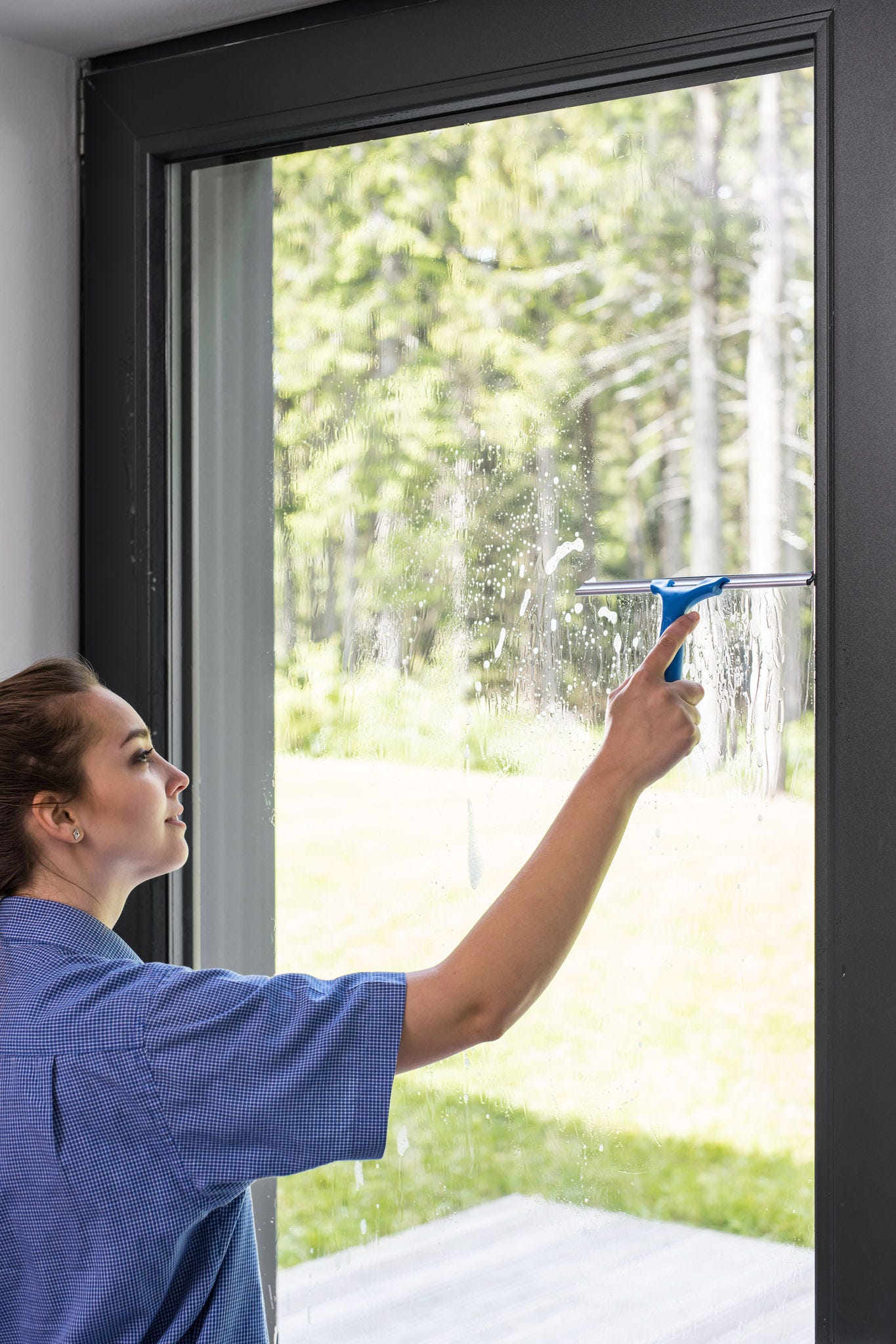 - Op z’n Frans: op het bovenste driekwart van de ramen ga je met de raamtrekker telkens van boven naar beneden. Op het onderste kwart maak je horizontale bewegingen.